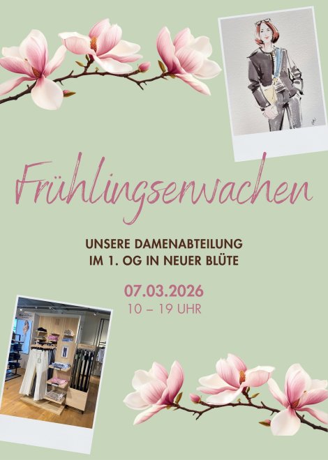 Unsere Models präsentieren Ihnen von 10 – 19 Uhr die neuen Kollektionen. Während des gesamten Events können Sie in entspannter Atmosphäre durch unsere Abteilungen stöbern.